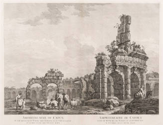 InscriptionsD Cunego Sc. Rome (l,r plate); C Clerisseau P. (l,l plate); AMPHITHEATRE OF CAPUA IN THE KINGDOM OF NAPLES THE BUILDING IS AT THE DISTANCE OF A MILE FROM THE PRESENT TOWN (l,l plate); AMPHITHEATRE DE CAPOUE DANS LE ROYAUME DE NAPLES CE MONUMENT EST A UN MILLE DE LA DITTE VILLE (l,r plate)