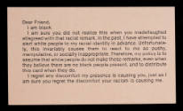 One of the premier intellectuals of our time, Adrian Piper is both an artist and a philosopher. In her art, she aggressively takes a feminist and an African-American point of view. Often participatory and performance based, her art interrogrates the viewer and attempts to aftect change in social behavior. This card, and others like it, was the focal point of an ongoing performance piece in the late 1980s. When confronted with a racially charged situation, Piper would hand out cards reading, "I am black. I am sure you did not realize this when you..." to draw attention to the participants' attitudes toward race.
