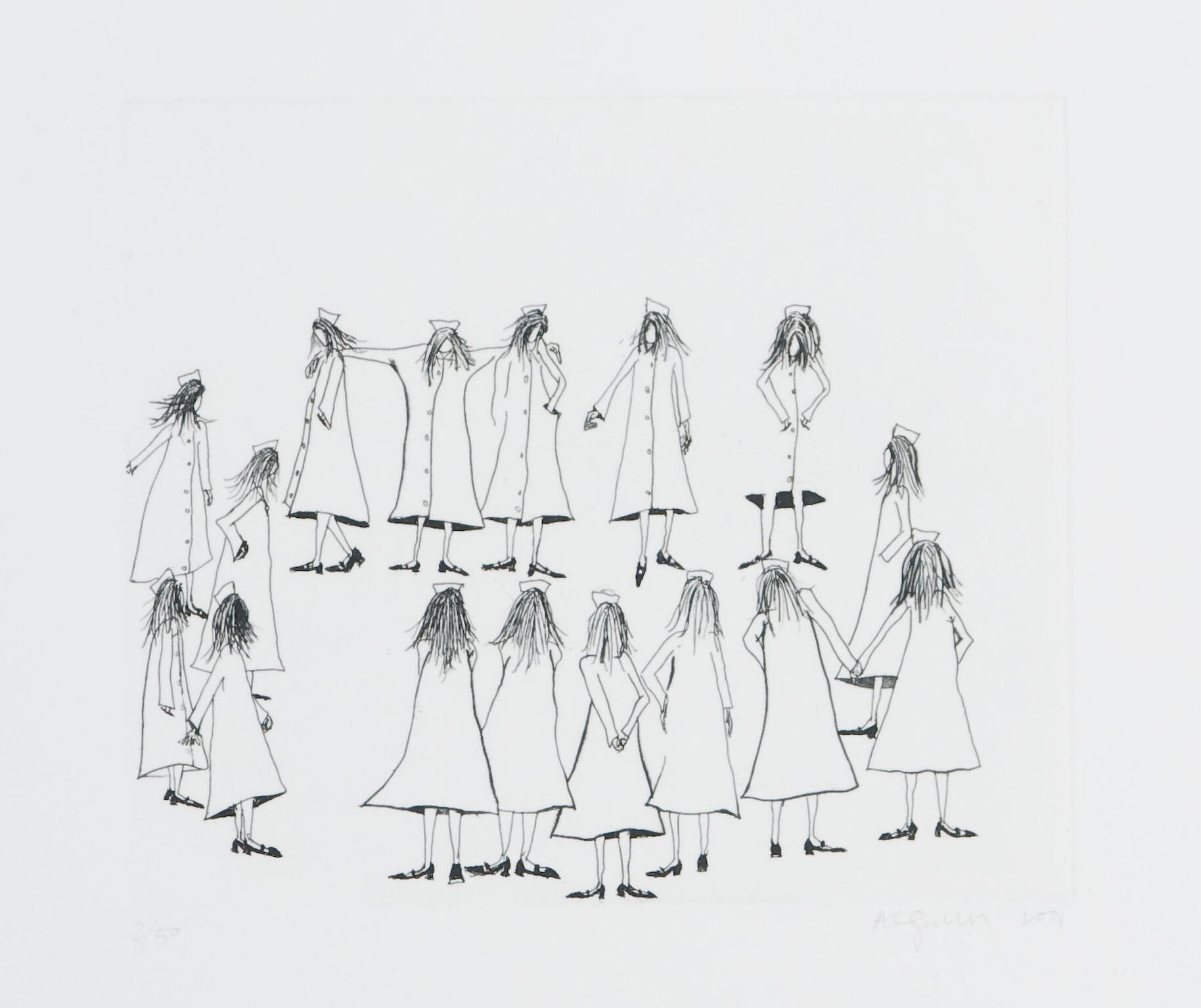Gaskell is best known for her large-scale color photographs, in which she presents young girls in a variety of psychologically charged situations. For example, in the wonder series, which references Lewis Carroll's Alice in Wonderland, girls sit alone with a set of chattering teeth, tumble down a flight of stairs, or swim in a pool of tears. The series hide, by proxy, and resemblance are even darker, with girls, both sinister and innocent, resting on stair steps, gathering under tumultuous cloud formations, or assembling new life forms. This untitled work, Gaskell's first print, depicts the recurring theme of nurses in her work and is the Des Moines Art Center Print Club's commissioned print for 2001.