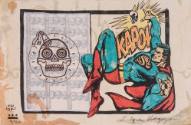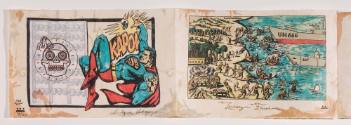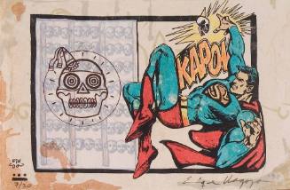 Chagoya's art explores the layers and clashes of culture and history, using cartoons, traditional images, and time travel. In The Return of the Macrobiotic Cannibal, the artist combines Mayan and Aztec imagery, Catholic iconography, reproductions of 16th-century European engravings, ethnic stereotypes, and 20th-century cartoon superheroes in eight wildly imaginative and visually dazzling images. The print is in the form of a bark paper, accordion-folded codex, such as those made in pre-colonial Mexico.