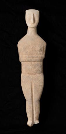 Label TextThe Cyclades are a cluster of small islands off the southeast coast of mainland Greece . During the Early Bronze Age (3000 – 2000 BC), culture on these island flourished due to natural resources such as marble, gold, and other precious metals. This figure is typical of Cycladic art – the form is severely reduced, the arms are crossed over the body, and female gender is defined. There is no universally accepted theory on the purpose of these idols. Possible interpretations include representations of ancestors, divinities, companions for the dead, status symbols, or personal totems.