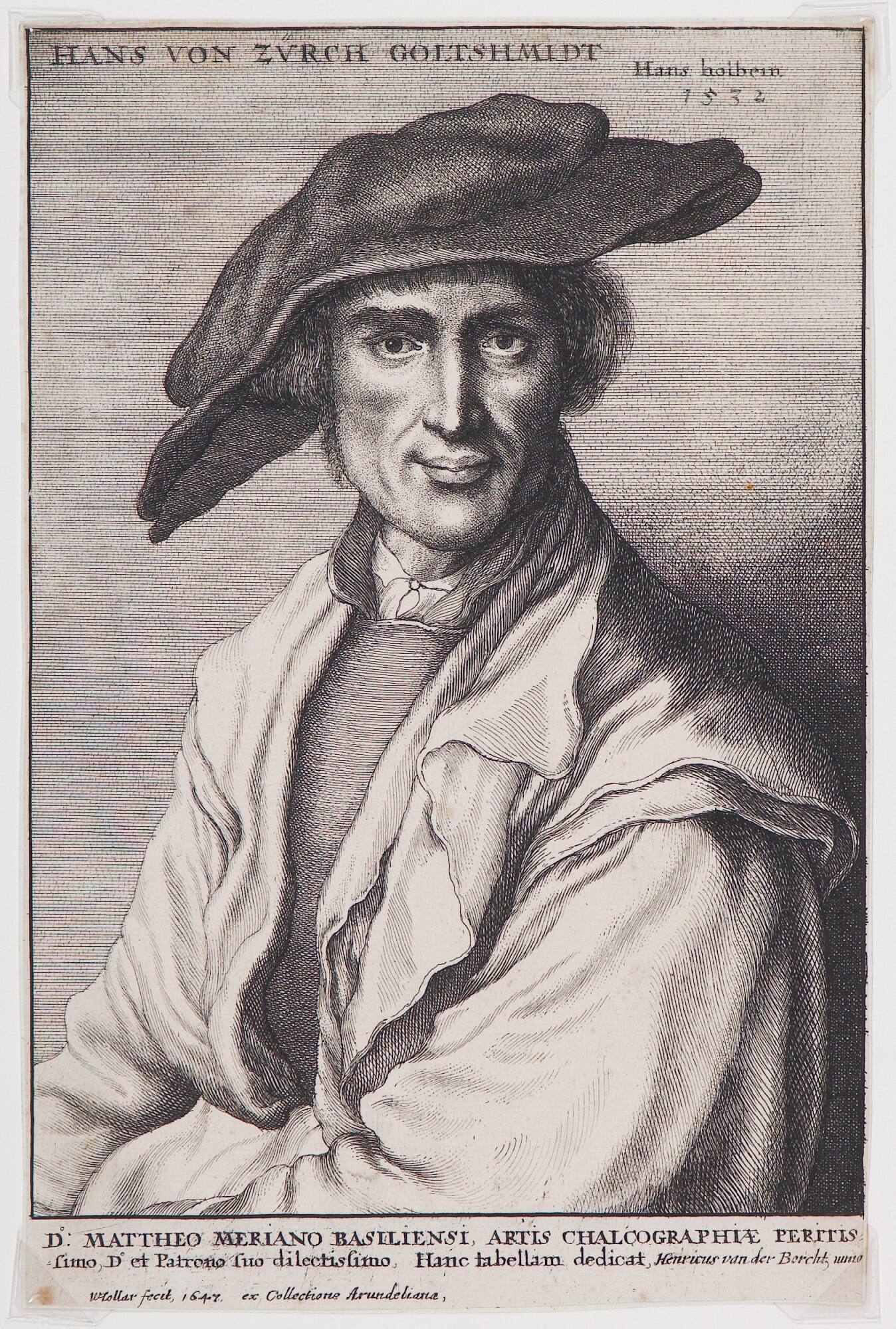 InscriptionsHANS VON ZURCH GOLTSCHMIDT (u,l plate); Hans Holbein 1532 (u,r plate); D: MATTHEO MERIANO BASILIENSI(S). ARTIS CHALCOGRAPHIAE PERITISSIMO D(educat) et Patrano Suo dilectislimo. Hanc tabellum dedicat. Henricus van der Borcht, uuno (l,c plate); ex Collections Arandeliana (l,l plate)