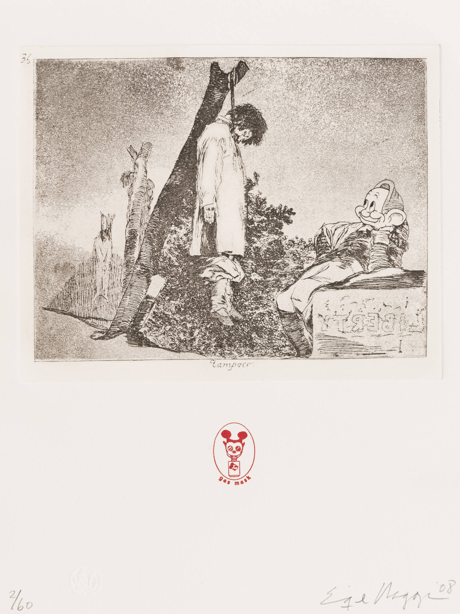 With humor and satire, Mexican-born American artist Enrique Chagoya addresses conflicting cultural realities in his work. Liberty Backwards (2008) is an homage to Francisco Goya's Tampoco fom the series "Disasters of War" (1810-20). In the grisly Goya image, a French soldier gazes indifferently at a hanged Spaniard. In the Chagoya version, the soldier's head has been replaced with that of Dopey from Snow White, pointing to the foolish nature of war.