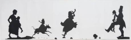 Kara Walker creates visually beguiling but horrific, over-the-top imagery of unimaginable violence to remind us of the sordid history of racism, sexual oppression, and vioence in America. SIlhouetted figures deployed across a long white sheet evoke shadow plays and the narratives of slavery. Her black silhouettes against white paper, derived from the 19th centure art of paper-cutting, symbolize black and white relations.