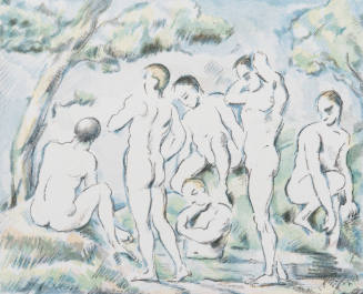 This mature work from 1897 is from an edition of 100 and is the artist's only published lithograph. It presents a recurring them in Cezanne's work--bathers. The print was commissioned and published by Ambroise Vollard, one of his Cezanne's dealers, in a portfolio of work by 31 artists. The work originates from a drawing by Cezanne on a litho stone. Each additional color comes from a different stone, following a color maquette created by Cezanne and printed by August Clot. Cezanne produced a major painting of the subject in 1900.