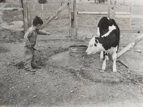 InscriptionsKIOWA 51: Even the first-grade Indian students at the Fort Still Indian School, take an interest in raising livestock and planting garden crops. Although such projects are part of their school work, becoming more difficult as the students progress to higher grades, the students take a genuine interest in the work as they share in the proceeds of the sale of their produce. Kiowa Indian Agency, Anadarko, Oklahoma. Photo by Sekaer, 1940 (verso u,c typed on paper in black ink and glued to photo); K51 (verso center, graphite); PF99100 (verso l,c graphite); NA-48 (verso l,r graphite)