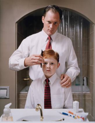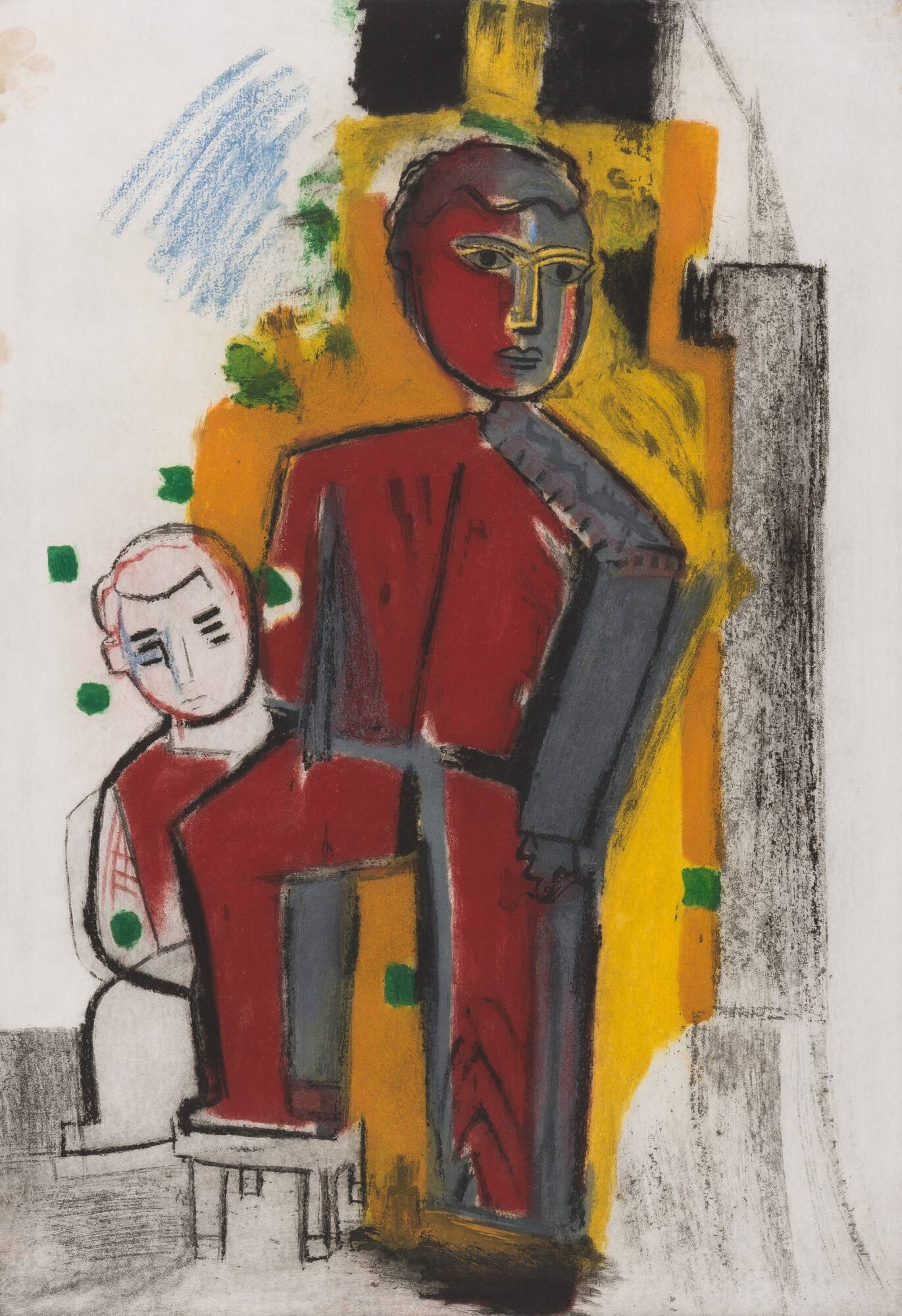 Father and Son, n.d., features a lumbering protector and a lingering child, composed from bold color and clean lines that reference the machine-like aesthetic of the early twentieth century. The work of this Italian artist focuses on heroic narratives that feature larger-than-life protagonists.