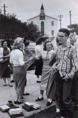 The "Russia" has just arrived from Batumi and is on her way to Odessa, Young Girls chatting with sailors on shore, Sukhumi on the Black Sea, Abkhazia, Georgia, U.S.S.R.
