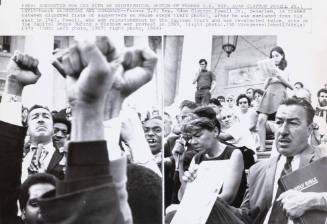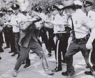 Inscriptions(Wx2)WASHINGTON, AUG., 14 -- WHITE HOUSE ARREST -- A member of a group calling itself the White House prayer group is removed from the White House Tuesday by White House Police. One member of the group said the protest was over United States bombing in Cambodia. (AP Wirephoto)(See AP AAA Wire Story)(wt31337stf/ct) 1973 [recto l,c typewritten in black ink, printed on sheet]