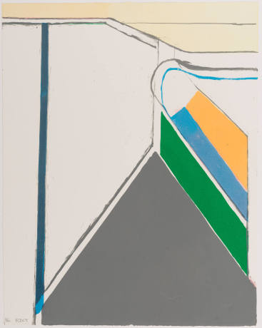 Whether his works portray figures or whether they appear to be nonrepresentational, Diekenkorn's chief concern is with the depiction and manipulation of space. This is done primarily by the use of color with lines often serving as directional guidelines. Traces of the artist's Abstract Expressionist past are most clearly (and paradoxically) evident in this print in the linear forms.
