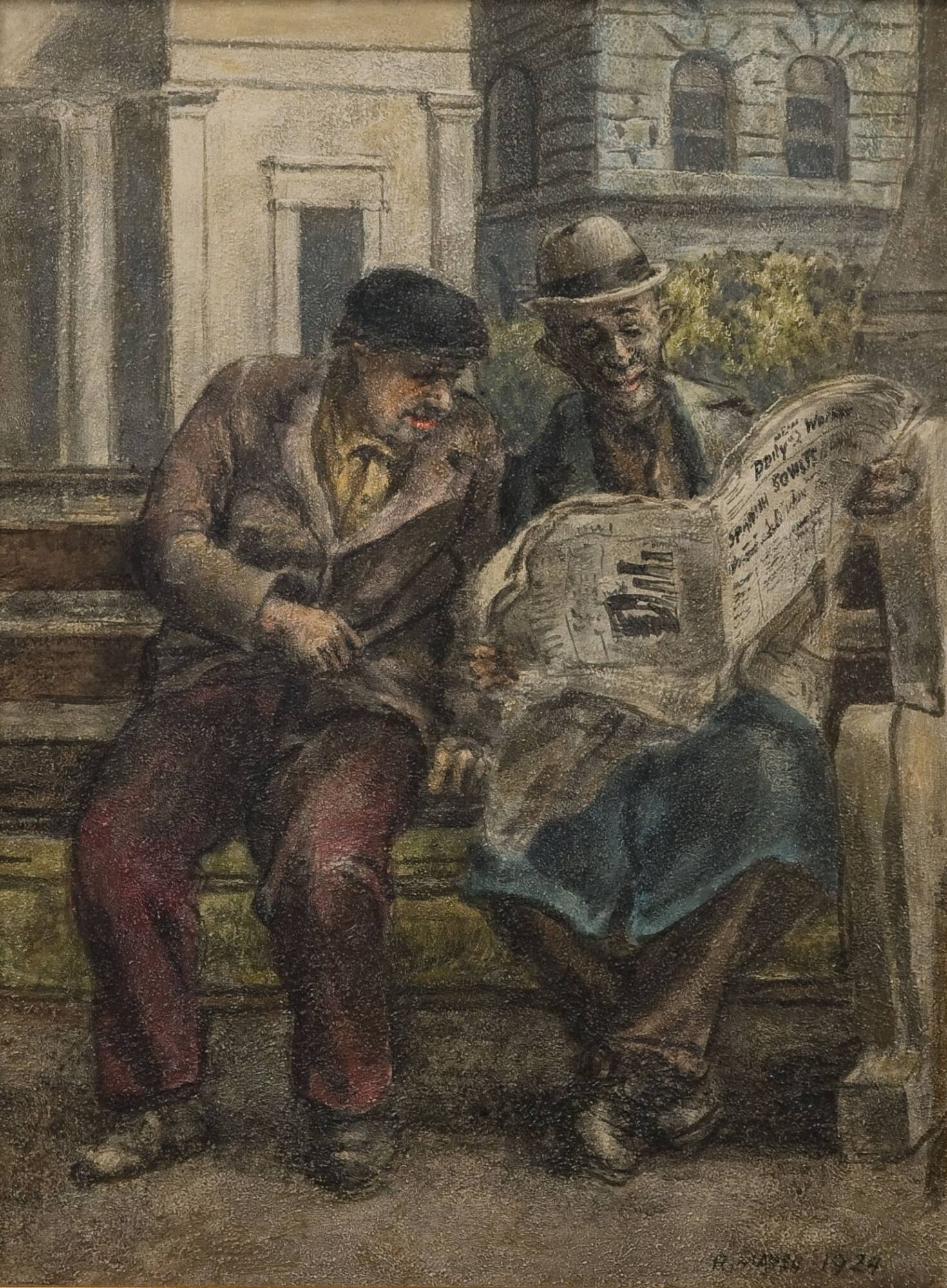 This painting depicts two men in Madison Square Park in New York reading the Daily Worker. This bequest was one of many made to a large number of museums throughout the country by the artist's second wife, Felicia Meyer Marsh.