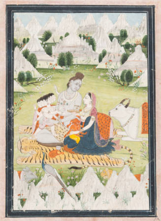 Shiva and Parvati with Ganesha and Subrahmanya and the Bull Nand in a landscape, late 18th century