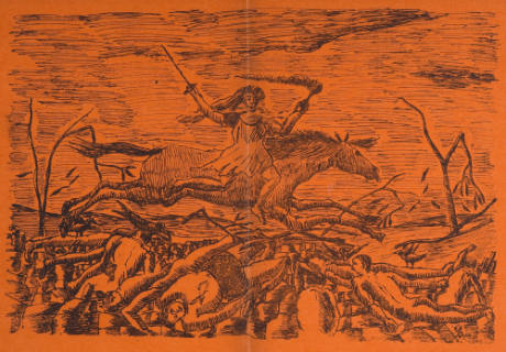 La Guerre (War) depicts a young female personification of war who sits sidesaddle on a dark horse galloping over corpses on a battlefield. War holds a sword and a smoking torch. She is grinning, nearly demented in an ecstacy of destruction and death. Crows feast on the dead. The bright orange paper heightens the surreal effetcs, as if illuminated by the glare of bomb blasts or fire.