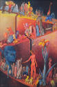 Label TextAlthough no hard evidence exists that this is an autobiographical painting, many of the mysterious figures and forms in The Path appear to play out events in Höch’s life. The tall, red woman in the lower center of the work bears a strong resemblance to the artist. Cycles of life and death are a prominent theme in the work. The path begins with an old man, then a young couple, a funeral, a separated couple, and finally a pregnant woman. All of these events are surrounded by a cavalcade of strange animals and plant-like forms, with two large flowers standing at path’s beginning and end. These blooms, and the old man standing near the beginning, may represent Höch’s father, an avid gardener who passed this love of nature onto the artist. Many images of children also appear, both in this work and the collages Höch created around this time. As the images of couples in this work suggest, her romantic life was very tumultuous during the 1920s, and she was preoccupied with having children.