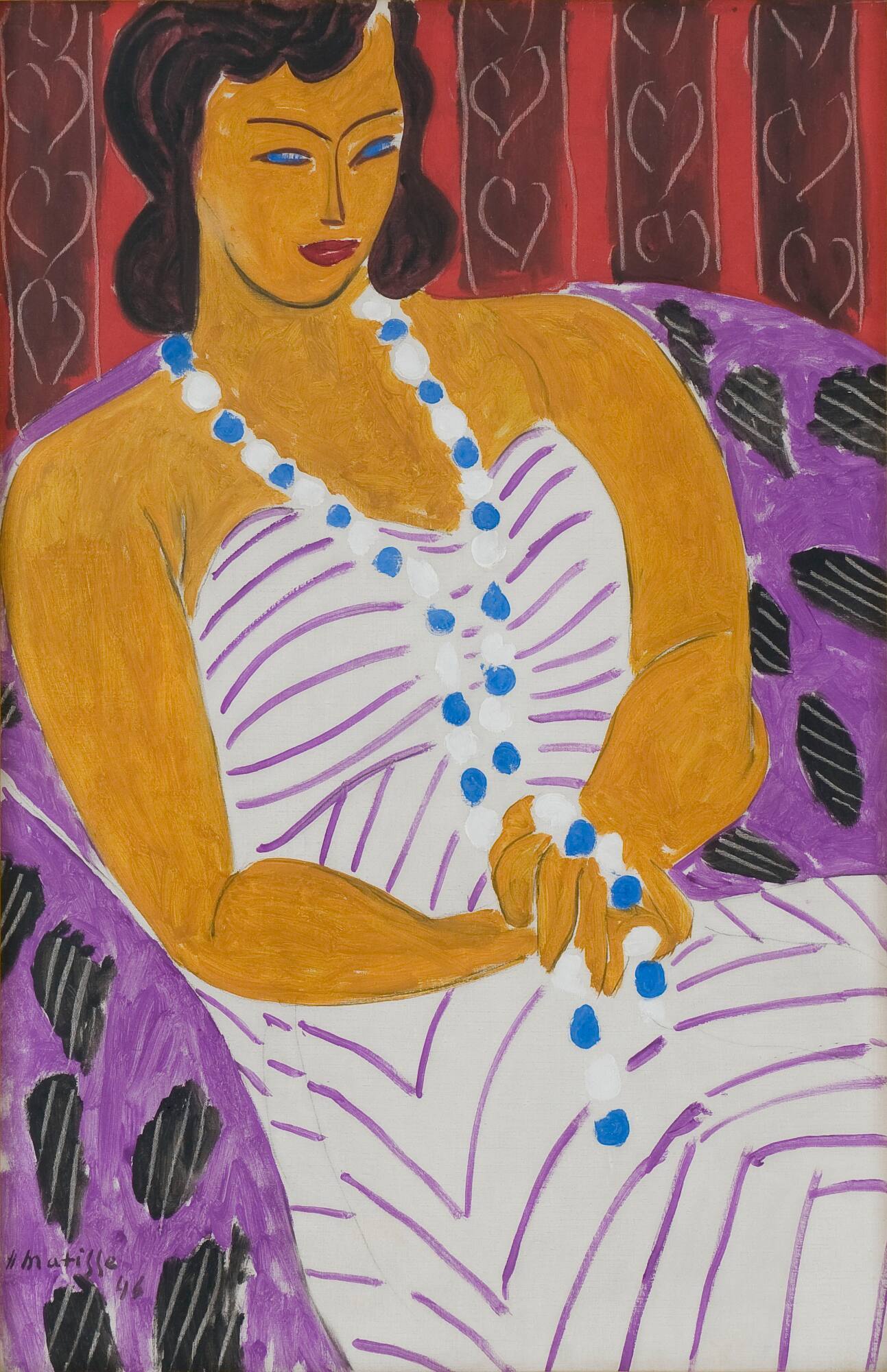 Label TextMatisse was one of the forefathers of Fauvism, a movement within Modernism known for its expressive use of strong, often non-naturalistic color. Despite the traditional subject matter of this work, it is typical of Matisse’s radical approach to painting as it highlights the physical reality of color and shape on a two-dimensional canvas rather than attempting to create an illusion of real space. The patterns on the wall, chair, and dress show Matisse’s interest in cut-outs or decoupage, and the woman’s refined features resemble an African mask. African, Oceanic, and other non-Western art objects were a strong influence on Matisse, as well as many other Modernists.