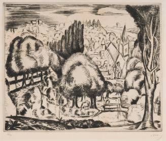 The first graphic work of Andre Derain to enter the Art Center collection is a highly characteristic and choice drypoint,.... A singularly fine impression, the print is rich with burr, forming the dark areas of the image. In style, it bears traces of Derain's Fauve period at the beginning of the century, with a freedom of drawing and design. In the structure of the landscape-trees, buildings and all, there is much more of the cubist style of Derain, which followed. And overall, it bears an unmistakably French charm and the effectiveness of the naive style.
