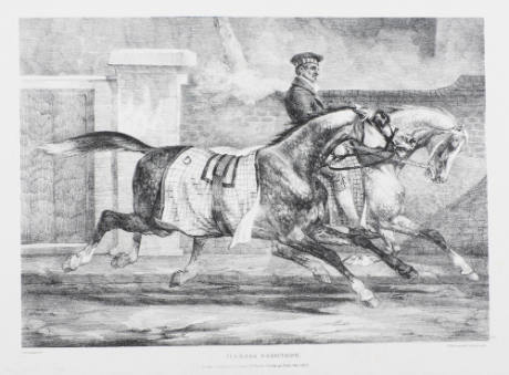 InscriptionsGericault inv. (l,l plate); Horses Exercising (l,c); London. Publishing by Rodwell & Martin New Bond Street. Feb. 1. 1821 (l,c); C. Hullmandel's Lithography (l,r)