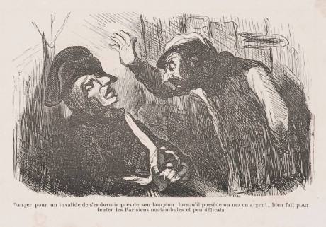InscriptionsDanger pour un invalide de s'endormir près de son lampion, lorsqu'il possède un nez en argent, bien fail poor tenter les Parisiens noetambules et peu délicats. (l,c plate)