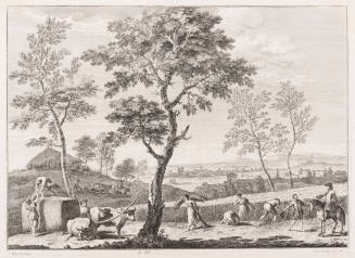 ...depicts a harvest scene of the late Renaissance. In addition to its fine quality as an etching, the work is also significant as a portrayal of historic conditions, interpreted in pastoral style.
