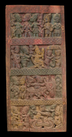 The four rectangular spaces comprising the door are filled with figures seen either in profile or full front, and the degree of relief carving appears to be the same throughout the entire composition. The coloring on the door and the abstract patterns on the bands enclosing each screen further heighten the decorative effect evident in this work.