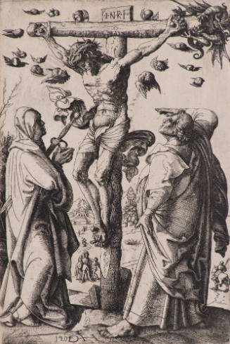 This Hopfer etching is an unusual early depiction of the image of the Virgin of Sorrows. Although artists connected with the goldsmith's craft had been printing engravings since at least 1446, the etching process was not used for printmaking until about 1503. The process is believed to have originated in the shop of German armor-makers, who etched designs in iron. Daniel Hopfer is thought to be the first artist to make printed etchings.