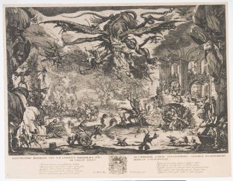 InscriptionsILLUSTRISSIMO...[Jacques Callot vows, dedicates and consecrates this print to the greatest and most illustrious man, Louis Phelypeaux, seigneur of La Vriliere, Consistorial Count and man of Sacred Orders.]   Informes larue...[Shapeless spectres-monsters lurking in gloomy pens-broke out of their Abyss, gathered in a multitude, and invade the earth and the light with their deadly poisons.  The appearanc of such great wickedness turned the Hermitage into Hell.  Meanwhile, what are you doing under the vault of a large rock, holy old man-do you feel the presence of so many enemies and despise them?  Nothing mortal touches you, nor do enticing Joys move your heart, nor does Love break it, nor does death frighten it.  A mind firmly set on the divine and gathering strength from God withstands on earth assaults that it will smile at in heaven.]
