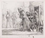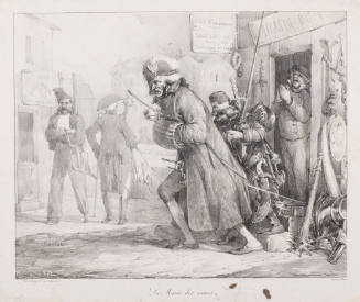 Inscriptions; Chez Gihaut, b.ard des Italiens No. 5 (l,l outside margin line); Lith. de Villain (l,r); La Manie des armes (l,c)