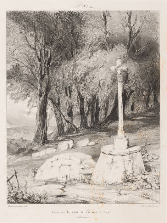 Inscriptionslettered "P. 82 bis." U/C margin; "Eugène Isabey 1831" L/L margin; "Lith. de Engelmann" L/R margin; "Croix sur la route de Clermont à Royat | Auvergne" L/C
