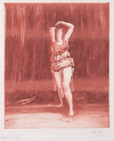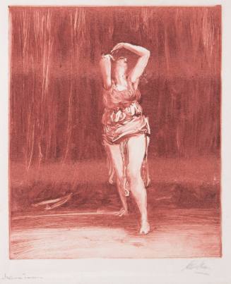 Isadora Duncan, the famous American dancer, returned to the United States from France in 1914 at the outbreak of World War I for her first appearance since the tragic death of her children two years previously. Sloan was captivated by her grace and beauty. Although she lacked slenderness, she was still, in his opinion, the greatest dancer on earth. Sloan depicted Duncan in numerous paintings, drawings and monotypes. She is also the subject of one of his etchings.