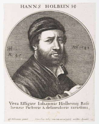 InscriptionsVera Effigies johannis Holbeinis Basi -/-liensis Pictoris & delineatoris rarissimi (l,c plate); ipse Holbeinius pinxit Wenceslaus Hollar aqua forti aeri insculpsit ex Collec: Arundel: 1947 (l,c plate)