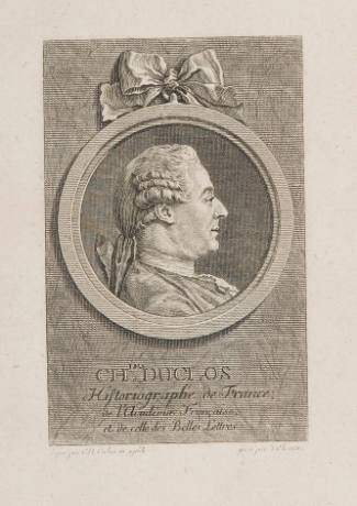 InscriptionsCH. Les Duclos  |  Historiograph de France  |  de l'Academie Française  |  et de celle des Belles Lettres (l,c); dessiné par C.N. Cochin en 1763 (l,l); gravé par D'Elvaux (l,r)