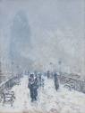 Recently acquired for the J. Emory Coffin Collection "Bridge in Snow" is an outstanding example of the impressionist technique combined with an unusual palette to interpret the scene. The cold greys accent the cold light. Figures emerge from the background where architecture and atmosphere are all but one.