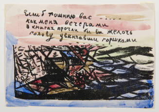 Born in 1886, Rozanova studied at the Bolshakov School of Art and the Stoganov School of Applied Art, Moscow, 1904 to 1910. This print is from a set of 23 lithographs with watercolor and is a collaboration with the avant-garde poet Alexei Kruchenykh, whom she later married.