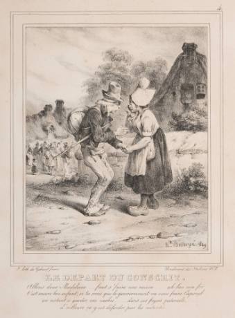 Inscriptions4.(u,r); G. Lith de Gihaut freres  |  Boulevard des Italiens No. 5 (l,c); LE DEPART DU CONSCRIT.  |  Allons donc Madeleine… faut s'faire une raison… ah ben ma foi  |  t'est encore bon enfant, si tu crois que le gouvernement va vous faire Caporal  |  en restant a garder vos vaches… dans ses foyers paternel…  |  d'ailleurs ça y est défendu par les autorités.(l,c)