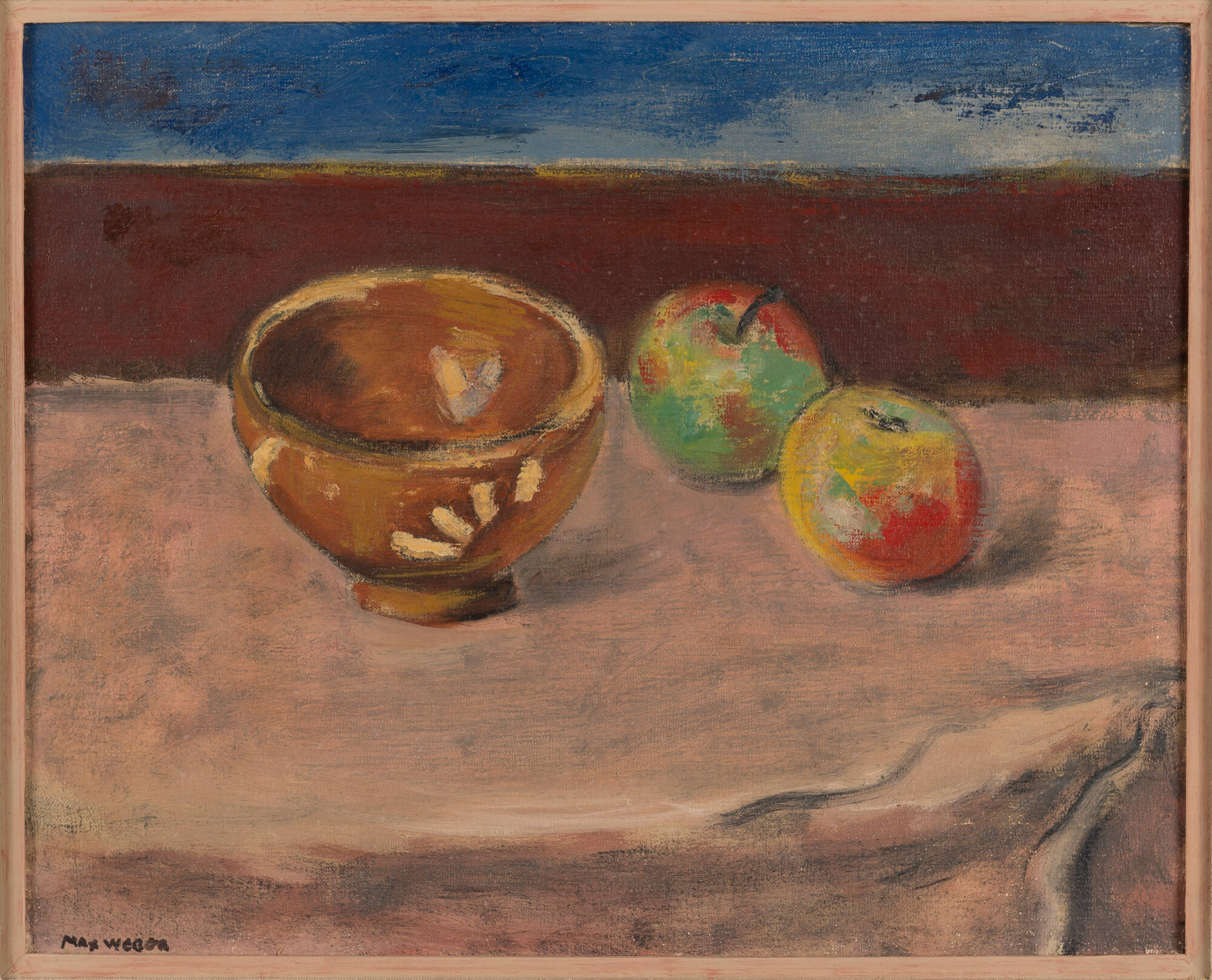 The influence of Cezanne is aopparent during the mod-1920's, but later personal qualities of Weber's style are also appearing in such techniques as the clash if intense colors in the two apples. Source: Bulletin, October 1962.