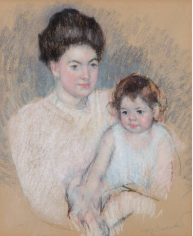 [This painting] is of Mary Cassatt's favorite subject: A mother holding a child. Dating from about 1900, it has the sketchy "unfinished" look of many of her pastels, with only the heads and central portions of the figures fully modeled in glowing flesh tones.