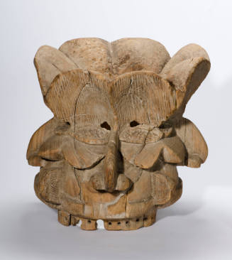 Incised around the Art Center's mask are some forty holes from which strands of raffia were hung. The mask is composed of four faces which are divided laterally by half-circular discs. Each face is defined by a continuous, horizontal mouth, large, flared nostrils and sharply undercut cheeks. Immediately above the open and incised oval eyes is a concave and perforated headdress which is open at the top of the mask.