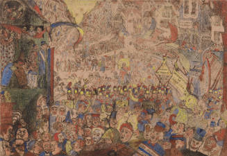 The Art Center's work, which is heightened by reds and greens and yellows, is an updating and a relocation of the traditional theme of the entry of Christ into Jersusalem. Ensor brought his Christ in Brussels, apparently at Mardi Gras, for color and excitement abound, though not joy or good will. Banners proclaiming various political figures of the day and various businesses appear throughout the work. The caricatures and mask-like faces are menacing and the haloed figure of Christ in the center is nearly lost in the mass of humanity. Ensor very pointedly indicates that the reappearance of Christ into contemporary society would have had the same tragic result as did Christ's entry into Jerusalem.