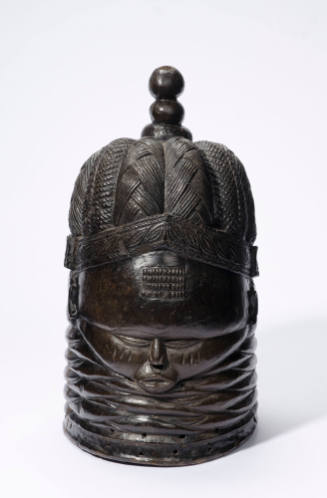 Referred to as a Bundu mask, it is the only African mask type used exclusively by women (although the masks are carved by men). These masks symbolize the guardian spirit of the Sande secret society. The closed eyes and pursed mouth would seem to embody the attributes of seriousness and spirituality. The complexity of the headdress, the broad forehead, and the rhythmic rings around the neck characterize the Bundu mask.The wide opening allows it to be worn more easily during ritual dances.