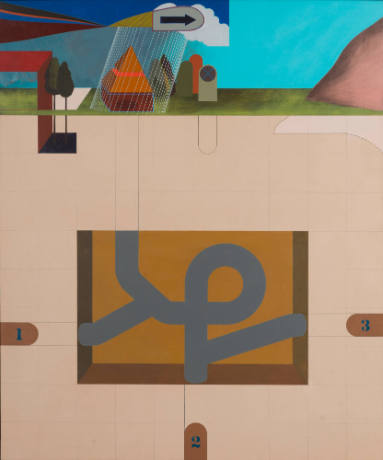 The painting is a representative example of Pease's use of natural and man-made forms which have been abstracted and juxtaposed in an airless landscape. The artist was born in 1932 in bloomington, Illinois and received his training at the University of Wisconsin.