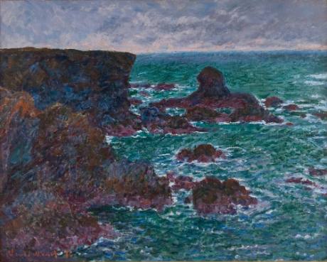 Monet painted this picture during a two-month stay at Belle-île, an island in the Atlantic Ocean just south of Brittany, France. The towering cliffs and rock formations appealed to the artist, who noted “Not a tree for ten kilometers, some rocks and wonderful grottoes; it’s sinister, diabolical, but superb.” The challenging terrain did not deter Monet from painting outdoors. With the help of a local fisherman nicknamed Poly, he managed to set up his easel at preferred locations and protect himself from the constantly changing weather by wearing a makeshift rain slicker. Of the violent waters just off Belle-île’s dramatic shoreline, Monet wrote “It was a joy for me to see the sea in all its fury; it was like a drug.”