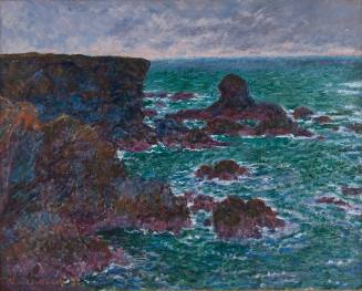 Monet painted this picture during a two-month stay at Belle-île, an island in the Atlantic Ocean just south of Brittany, France. The towering cliffs and rock formations appealed to the artist, who noted “Not a tree for ten kilometers, some rocks and wonderful grottoes; it’s sinister, diabolical, but superb.” The challenging terrain did not deter Monet from painting outdoors. With the help of a local fisherman nicknamed Poly, he managed to set up his easel at preferred locations and protect himself from the constantly changing weather by wearing a makeshift rain slicker. Of the violent waters just off Belle-île’s dramatic shoreline, Monet wrote “It was a joy for me to see the sea in all its fury; it was like a drug.”