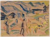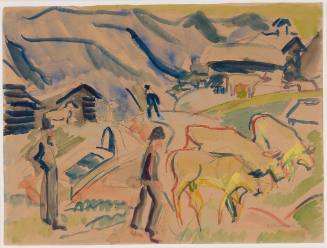 Brief military service had a ruinous effect on Kirchner's health, and in 1917 he moved to Switzerland for recovery, where he remained until his death in 1938. Here, the intense feeling of his earlier work ws carried on: the quality of powerful forces within nature are still present. But this intensity is modified, especially in the Swiss landscapes, with a balancing sense of enjoyment in nature and a harmony of man and animal. Source: Bulletin, SUmmer 1964.