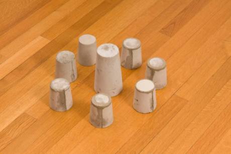Feher is best known for intimate, human-scale sculptures, such as Keep, an early but pivotal work. It was made by filling eight found paper cups with a binding sand mixture. After removing the cups to expose the cast forms, the artist positioned them in a layout reminiscent of architecture.