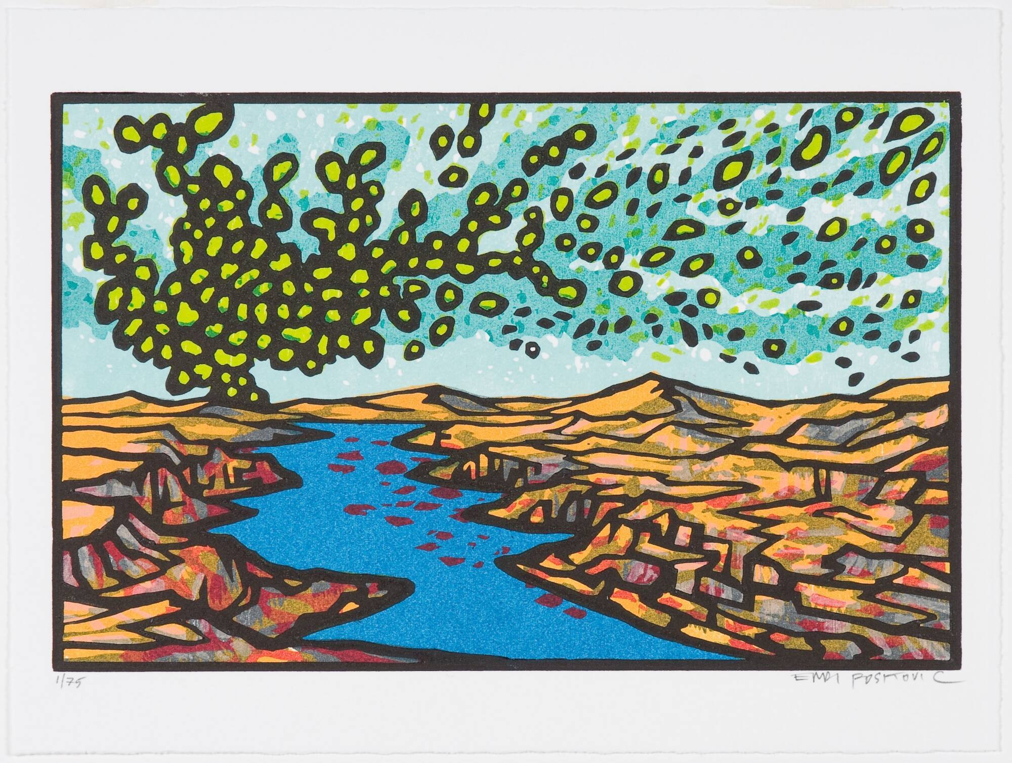 Endi Poskociv depicts edgy, enigmatic landscape images of a blasted, restless earth in his masterful color woodcuts. inspired by the American western landscape as well as by the visionary landscape prints of the 17th-century Dutch artist Hercules Seghers.