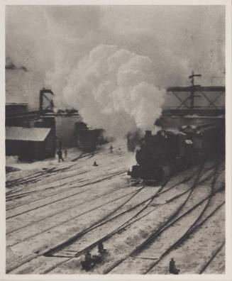 Many of these works were printed as photogravures--etchings made by exposing a photographic negative to a copper plate coated with a photosensitive etching ground. Photogravures feature the richness of intaglio printing and the tonal range of photographs. In this photogravure, the blackness of the locomotive, the tracks against the white snow, and the billowing steam create a stunningly dramatic image that evokes heat and cold, design and power. The location of the view has been identified as photographed from the 48th Street bridge over the railroad yards in New York.