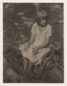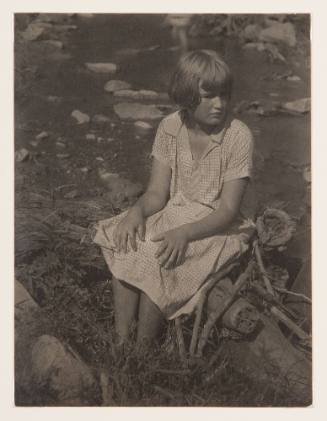 Girl in plaid dress sitting on log, ca. 1925