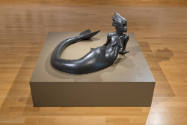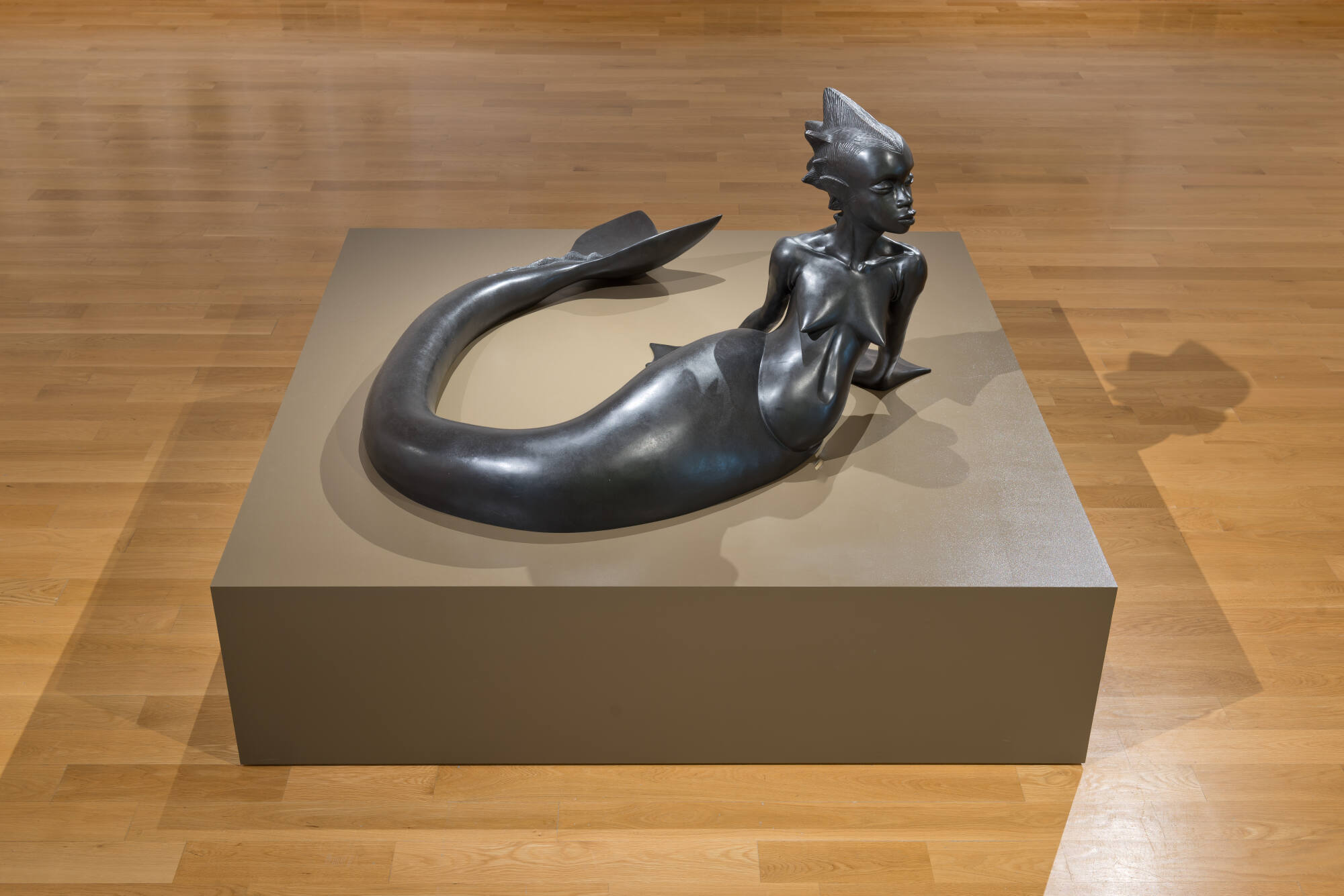 Water Woman is a stylized, black bronze sculpture of a nguva, a water-woman of East African folklore that blends human characteristics with those of the dugong, an endangered relative of the manatee. The artist has said the nguva represents a "bewitching female aquatic being with powers to entrance and drown susceptible mortals." In contrast to the ubiquitous Western iconography rooted in Hellenic, Nordic, and Anglo-Saxon depictions of silken-haired women with pale skin, here the siren is represented by the luminous, charcoal colored female body, which is a vein if inquiry central to Mutu's work.