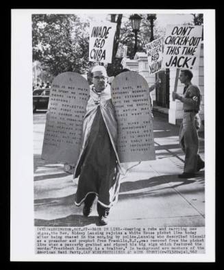 Inscriptions(Wx8) WASHINGTON, OCT.27 -- BACK IN LINE -- Wearing a robe and carrying new signs, the Reverend Sidney Lansing rejoins a White House picket line today after being chased in the morning by police. Lansing who described himself as a preacher and prophet from Franklin, NJ, was removed from the picket line when a passerby grabbed and ripped his big sign which featured the words: "President Kennedy is a traitor." In the background are members of the American Nazi Party. (AP WIRE PHOTO)(SEE AP WIR STORY)(rw71320wjs).932 [recto l,c typewritten in black ink, printed on sheet]