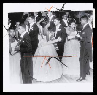 Inscriptions(WX1) WASHINGTON, Dec. 28 -- NEGRO DEBS DANCE AT THE WILLARD -- Negro school girls in traditional white gowns, with escorts wearing white ties, dance last night in the crystal ballroom of the Willard hotel, a capital landmark often called "the residence of the presidents." Fourteen Negro girls made their debut at the party. In four ground are, left to right, Jean Walburg and Erskine Taylor; Lorraine Maples with Jules Lucas, and Barbara Johnson, whose partner is Clarence Simpson, son of the Liberian ambassador. (AP Wirephoto)(ee30940post) 1954 (See Wire Story) [verso u,c typewritten in black ink, printed on sheet attached to photograph]